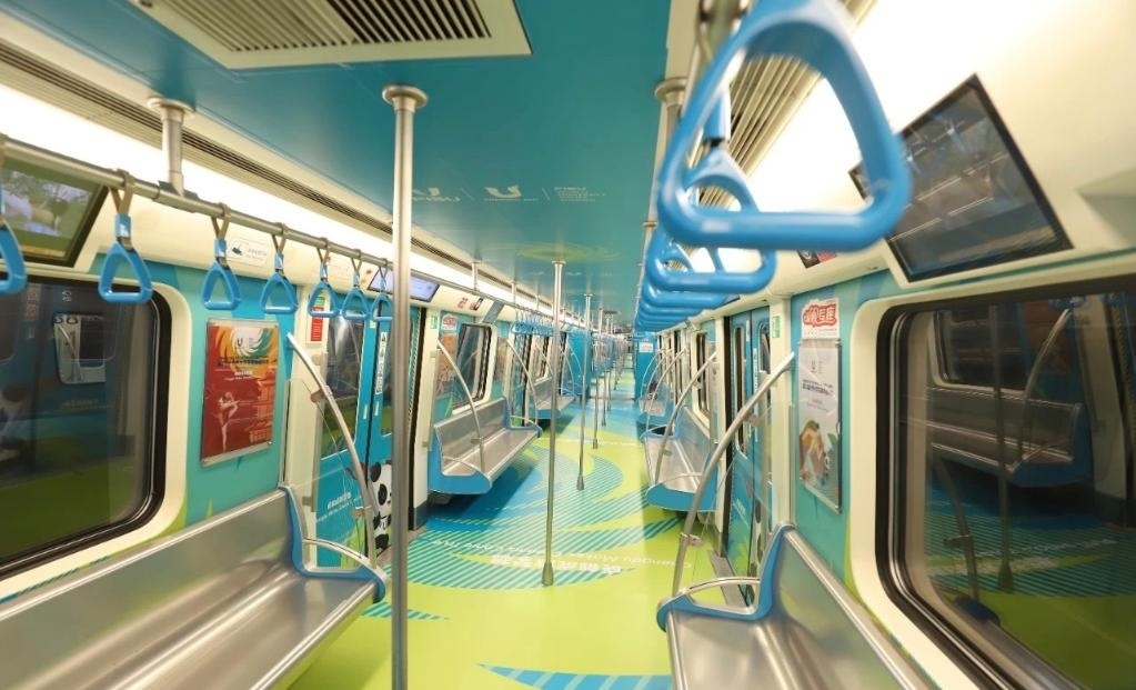 整體車廂打造創(chuàng)新植入了色彩明快、充滿青春氣息的“移動運動場”概念,立面畫面則結(jié)合青春動感的大學生形象,并選用田徑、網(wǎng)球、籃球、體操等運動的代表性動作為設(shè)計元素,全面凸顯成都大運會賽事核心主題。