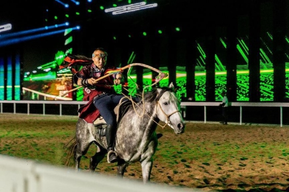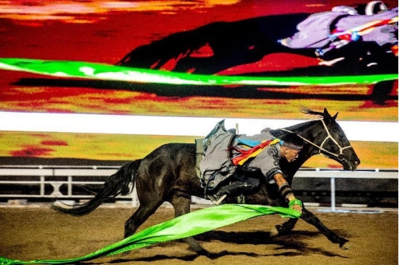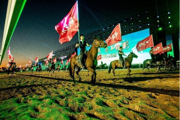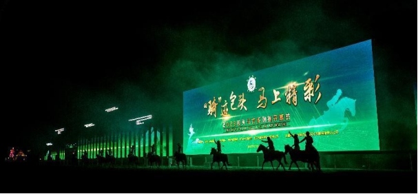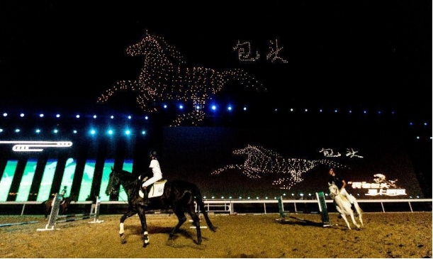 開幕式文體表演由《馬術(shù)方陣一馬當(dāng)先》、歌伴舞《我的城我的馬》、《名馬展示策馬揚(yáng)鞭》、《單馬技巧雙翼神馬》、《馬障礙秀躍馬揚(yáng)鞭》、《馬術(shù)秀人馬合一》、歌伴舞《騎跡包頭》、《無人機(jī)秀馬上精彩》八塊內(nèi)容組成。當(dāng)晚的賽汗塔拉馬術(shù)賽場流光溢彩、氣氛熱烈,場內(nèi)座無虛席、歡聲雷動(dòng)。20時(shí)30分許,主騎手手持國旗,副騎手手持馬城旗幟,運(yùn)動(dòng)員方陣、民族方陣、女騎方陣、馬主方陣入場,騎手們精神飽滿、英姿颯爽,不時(shí)揮手致意,現(xiàn)場觀眾用熱烈的掌聲和歡呼聲,歡迎他們的到來。達(dá)茂旗9歲賽馬冠軍阿茹樂手持彩旗引出世界名馬亮相,40對人馬合一的“千古馬頌”表演震撼全場,1000架無人機(jī)躍然天空,點(diǎn)亮“騎跡包頭 馬上精彩”的字樣……藍(lán)天、碧水、凈土的包頭在策馬奔騰的馬術(shù)競技中拉開了“中國馬城”的壯麗畫卷。