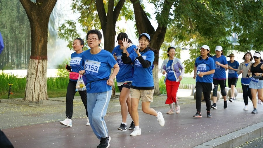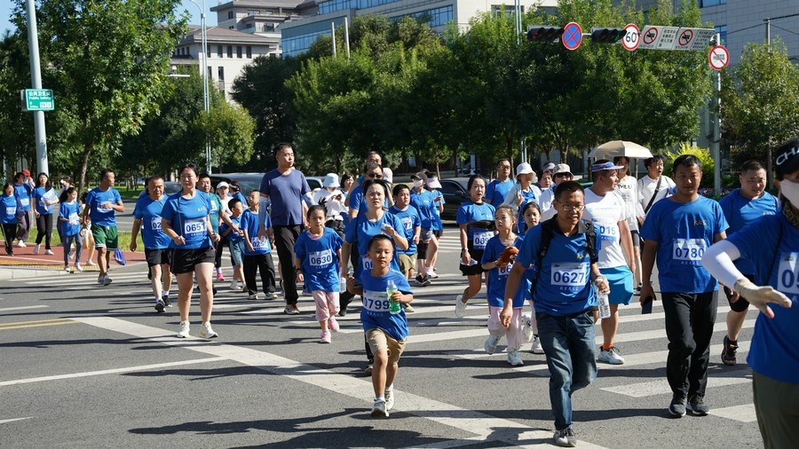 上午8時整,勞動公園彩旗飄揚,1400名青城跑者聚集在此,隨著清脆的笛鳴響起,身著藍色運動服的青城跑者們奔跑在陽光照射下的步道上,沿途盡賞青城美景,盡享運動健身之樂。