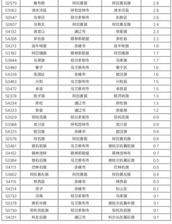 小雪:24個(gè)旗縣共28個(gè)站出現(xiàn)小雪,其中,阿拉善盟阿拉善左旗烏斯太2.4毫米、通遼市奈曼旗青龍山2.3毫米、錫林郭勒盟多倫縣2.2毫米。