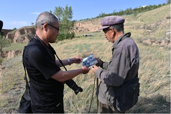 鏡頭見證滄桑,筆尖記錄百姓。這些年,只要疫情緩解,長城人沒有停下腳步,而是一次又一次去看長城、看邊堡、看邊墻下的鄉(xiāng)親們。車靜靜地行駛在空曠、蒼涼的長城腳下,76歲的牧羊人呂三良正在長城邊牧羊。2022年5月24日,呼和浩特市長城科普學(xué)會會員追隨牧羊人的腳步,把照片送到呂三良手中,看著老人端詳著照片里的自己,會員們特別滿足。這,難道就不是一個攝影人的長城情懷、百姓情懷嗎?(郭雁平   高曉梅)