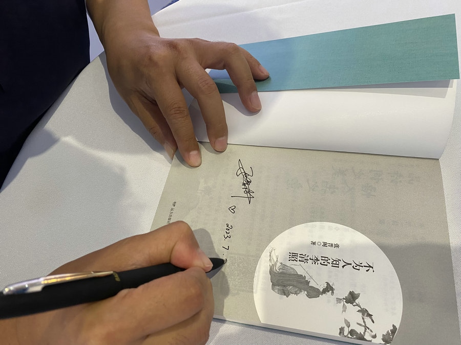 圍繞某些宋人作品中記載的李清照“流落以死”、李清照卒年的多版本說法、李清照的詩詞風(fēng)格為什么會從婉約轉(zhuǎn)變到豪放等“疑點”,張晉閣先生為大家講述了《不為人知的李清照》的寫作緣由、研究經(jīng)歷、文字表達(dá)形式和內(nèi)心希冀。隨后,兩位讀者分別提出“您最喜歡李清照的哪一首詩詞”、“對李清照的寫作產(chǎn)生深遠(yuǎn)影響的人是誰”這兩個問題,張晉閣先生分享了自己的看法并朗誦了優(yōu)美的詩詞佳作,現(xiàn)場交流、互動氣氛熱烈。活動結(jié)束后,張晉閣先生為讀者朋友們簽名留念。多位年輕讀者表示,通過閱讀《不為人知的李清照》,加深了他們對古典詩詞的喜愛。