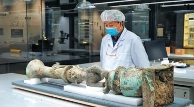 文物修復(fù)四川省文物考古研究院三星堆遺址工作站站長雷雨在查看拼對(duì)成功的鳥足曲身頂尊神像。新華社記者 肖 林?jǐn)z