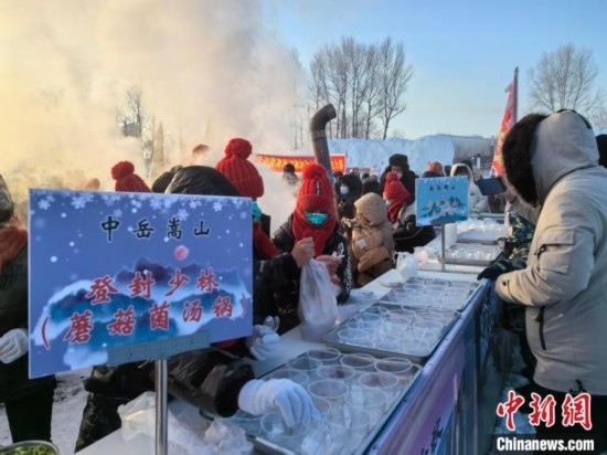 活動現(xiàn)場展示的寒地美食是一大亮點(diǎn)。熱氣騰騰的“登封少林”“泰安福祿”“華山論劍”等極具武俠味道的“江湖美食”讓參會者大飽口福,忘卻了-26℃的寒冷。
