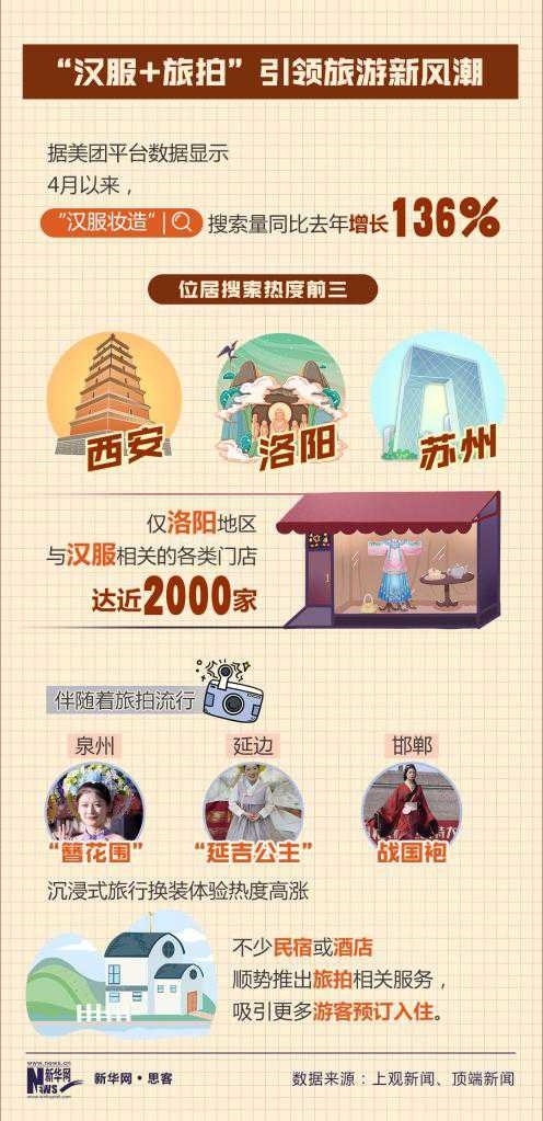 美團(tuán)平臺數(shù)據(jù)顯示,4月以來,“漢服妝造”搜索量同比增長136%。西安、洛陽等街頭,隨處可見身著漢服的年輕人在博物館、遺址公園等景區(qū)打卡拍照,摩肩接踵間皆是“貴妃”,文博景區(qū)附近不少商鋪以漢服妝造店為主。不少民宿或酒店,順勢推出旅拍服務(wù),吸引更多年輕人預(yù)定入住。