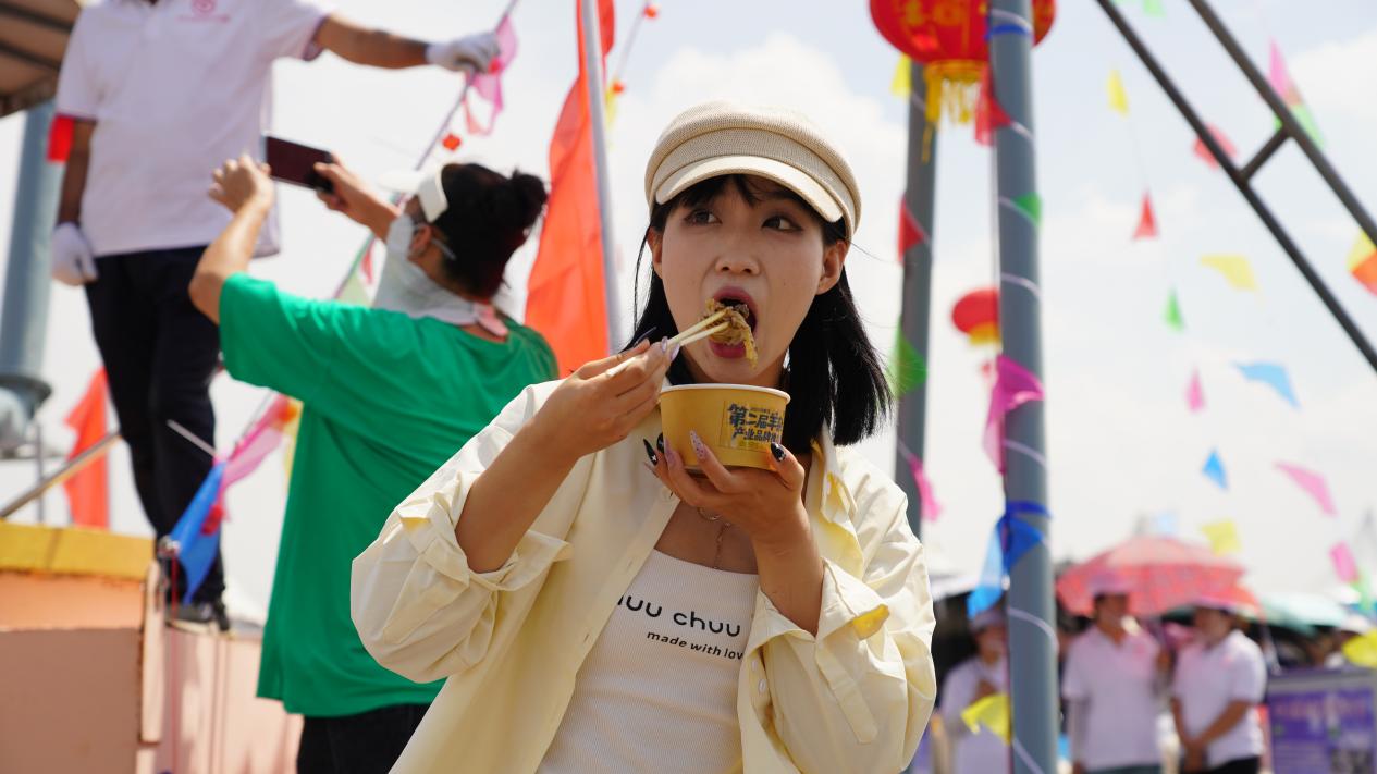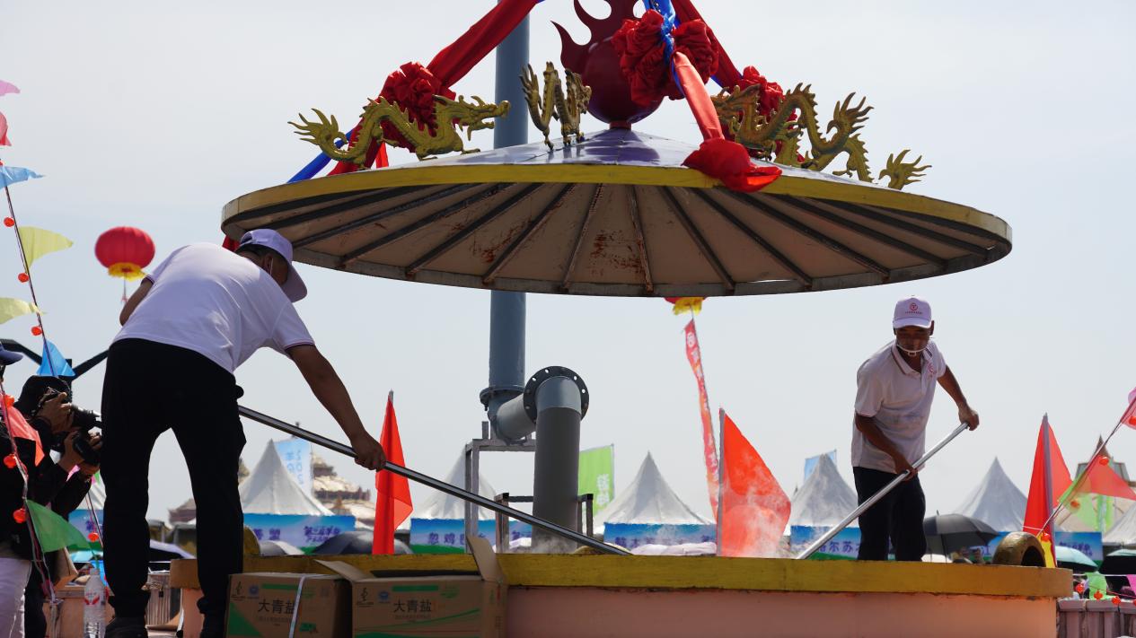 活動現(xiàn)場,巨型銅鍋穩(wěn)居C位,隨著鍋蓋打開,熱氣裹挾著濃郁香味沖天而起,紅亮的湯汁中翻滾著羊腸、羊肚,引得圍觀群眾頻頻點贊。