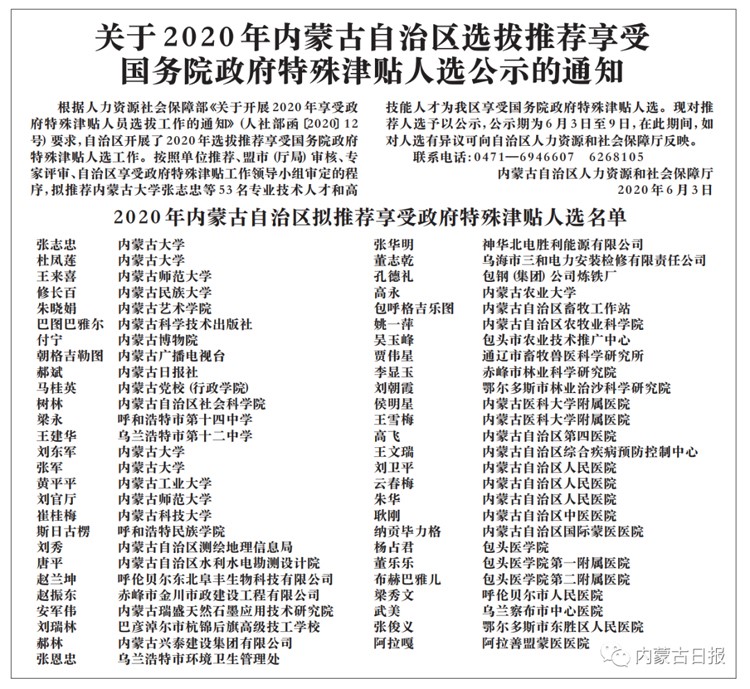 關(guān)于2020年內(nèi)蒙古自治區(qū)選拔推薦享受國務院政府特殊津貼人選公示的通知