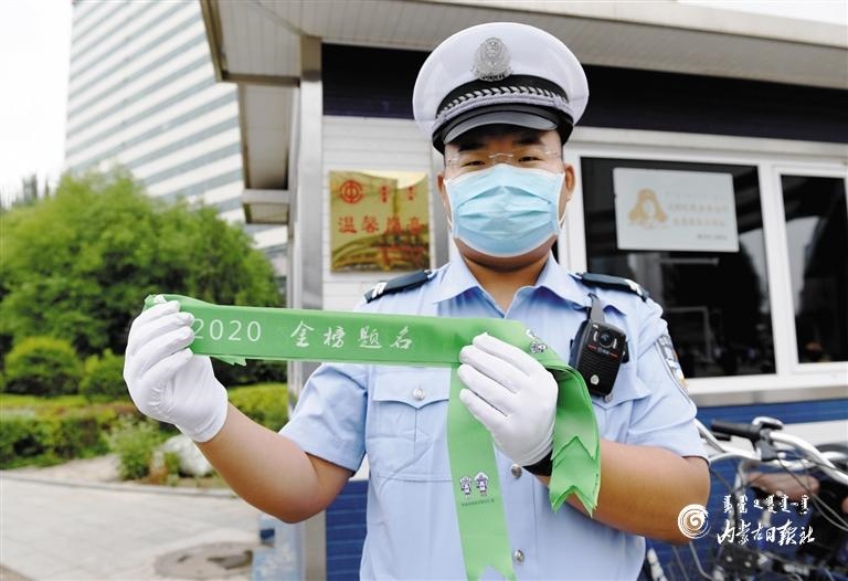 7月5日,呼和浩特市交警支隊賽罕大隊二中隊民警正在展示綠絲帶。為確保接送考生的車輛不被堵在路上影響考試,呼市交管支隊制作了25000條綠絲帶,家長或考生可以去市區(qū)考場附近的交警崗?fù)っ赓M領(lǐng)取,“綠絲帶”要掛在機動車左側(cè)的后視鏡上。(內(nèi)蒙古日報記者 孟和朝魯 攝)