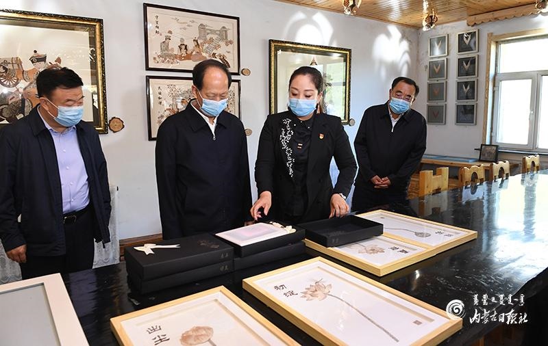 8月10日,自治區(qū)黨委書記、人大常委會主任石泰峰來到興安盟阿爾山市白狼鎮(zhèn)林俗文化產(chǎn)業(yè)發(fā)展有限公司,了解樹皮畫產(chǎn)業(yè)助力脫貧和非遺項目傳承發(fā)展情況。內(nèi)蒙古日報記者 袁永紅 攝