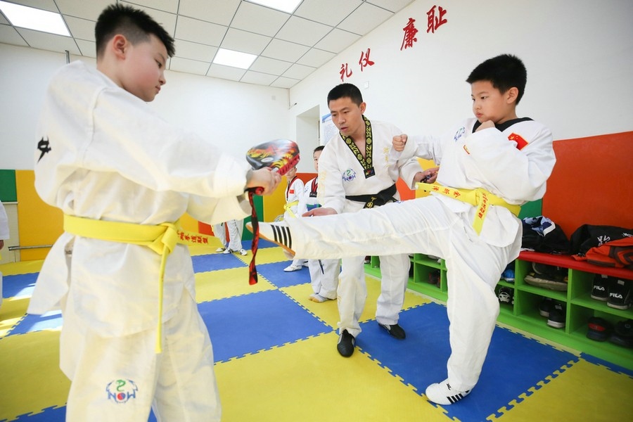 夏學偉老師正在教同學們練習跆拳道  彭瑞誠 攝影