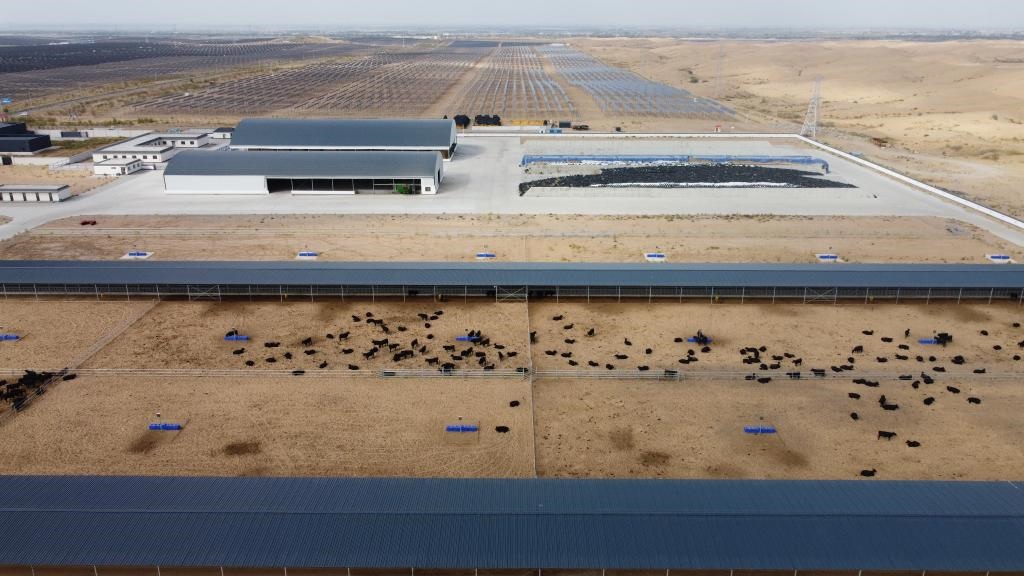 “這是我們?cè)诠夥卮蛟斓难h(huán)經(jīng)濟(jì)項(xiàng)目。”中畜科技有限公司肉牛標(biāo)準(zhǔn)化養(yǎng)殖場(chǎng)負(fù)責(zé)人石龍說,養(yǎng)殖場(chǎng)肉牛產(chǎn)生的糞便可以作為光伏基地板間種植作物的肥料,改善沙地土質(zhì)的同時(shí)還能促進(jìn)作物生長,而這些作物又能作為飼料供應(yīng)養(yǎng)殖場(chǎng),循環(huán)發(fā)展的同時(shí)還能促進(jìn)沙漠生態(tài)改善。
