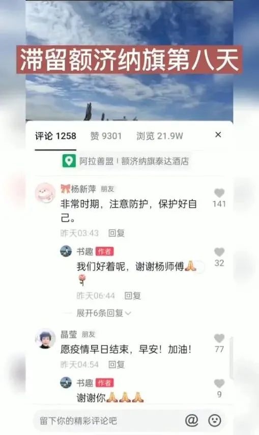 視頻發(fā)出數(shù)小時就吸引了上萬的瀏覽量。視頻發(fā)布者王女士在視頻中呈現(xiàn)一家人滯留額濟納旗現(xiàn)況的同時,也給和她同樣滯留額濟納旗的近萬名游客鼓勁:“如果你此時正在阿拉善,愿你如胡楊般堅強,積極應(yīng)對疫情。”