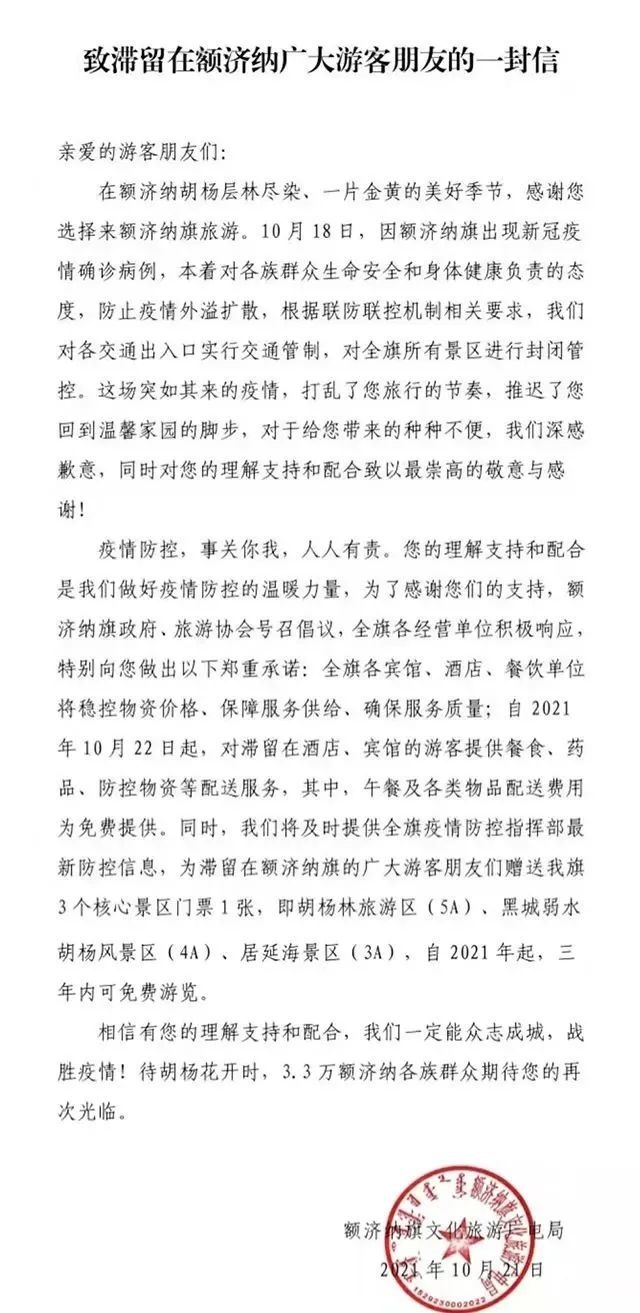 這封公開信中寫道,自10月22日起,對滯留在酒店、賓館的游客提供餐食、藥品、防控物資等配送服務(wù),其中,午餐及各類物品配送費用為免費提供;為滯留游客贈送胡楊林旅游區(qū)(5A)、黑城弱水胡楊風(fēng)景區(qū)(4A)、居延海景區(qū)(3A)3個核心景區(qū)門票1張,自2021年起,三年內(nèi)可免費游覽。