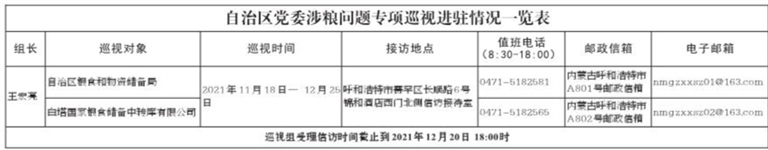 據悉,自治區(qū)黨委巡視組現場巡視時間為40天左右,巡視期間設立專門值班電話、郵政信箱、電子郵箱等。巡視組受理信訪時間截至2021年12月20日。根據巡視工作條例及相關規(guī)定,巡視組主要受理糧食購銷領域的相關問題反映,重點是黨員干部涉糧方面的違紀違法問題。其他不屬于巡視受理范圍的信訪問題,將按規(guī)定轉有關部門認真處理。