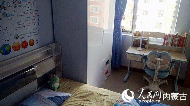 在對原有住房進(jìn)行規(guī)劃、設(shè)計(jì)后,施工隊(duì)開始裝修,并配備必要的家具、臥具和學(xué)習(xí)生活用品。歷時(shí)半個(gè)多月,一間以藍(lán)色為主色調(diào)的小屋建成了?,F(xiàn)在,屬于浩博的那一半臥室,泛黃的臥室墻壁被粉刷成淡藍(lán)色,換了新的小床和衣柜,新添置的書桌上擺滿了課外書,看起來整潔又溫馨。