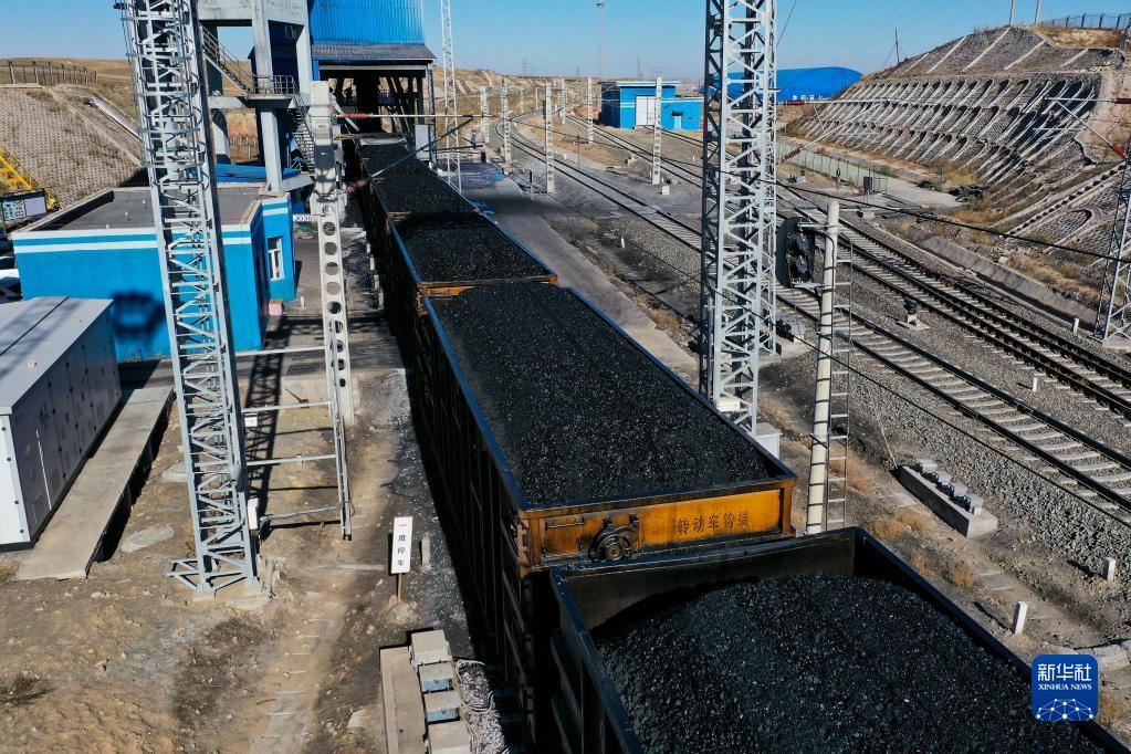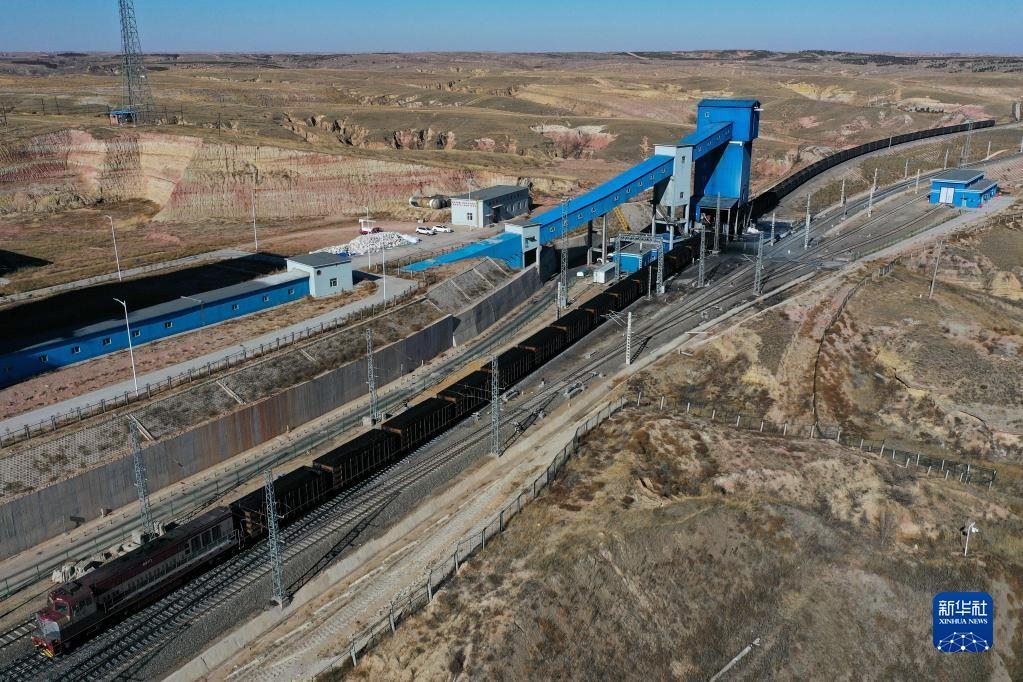 這是11月23日在位于鄂爾多斯市的淮河能源西部煤電集團色連二礦罕臺川集裝站拍攝的正在裝煤的列車(無人機照片)。新華社記者李志鵬攝