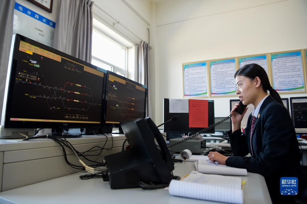 11月23日,在位于鄂爾多斯市的淮河能源西部煤電集團色連二礦罕臺川集裝站,工作人員在調(diào)度運煤列車。新華社記者朱文哲攝