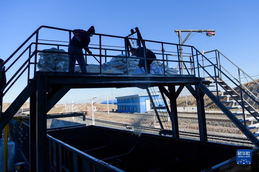 11月23日,在位于鄂爾多斯市的淮河能源西部煤電集團色連二礦罕臺川集裝站,工作人員在給運煤列車鋪撒防凍粉。新華社記者李志鵬攝