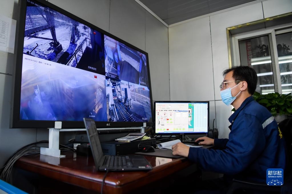 11月23日,在位于鄂爾多斯市的淮河能源西部煤電集團色連二礦罕臺川集裝站,工作人員在監(jiān)控裝煤設備運行情況。新華社記者李志鵬攝