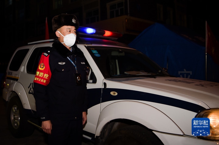 深夜安靜的街道上亮起了兩盞車燈,燈光中是正在巡邏的滿洲里市公安局道南派出所民警王滿。王滿和同事負(fù)責(zé)新世界小區(qū)B區(qū)的外圍管控工作,看到街邊有商鋪亮著燈,他站在門外大聲叮囑里面的人千萬不能出門,同事在他身后幾米處用車燈給他照明。