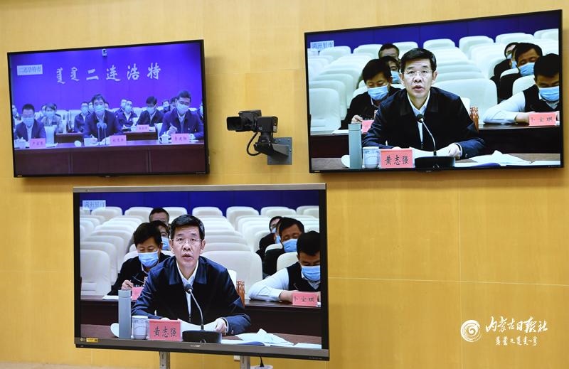 12月31日,自治區(qū)黨委書(shū)記、人大常委會(huì)主任石泰峰在呼和浩特主持召開(kāi)重點(diǎn)口岸新冠肺炎疫情防控和通關(guān)情況視頻調(diào)度會(huì),與包頭市滿都拉口岸視頻連線。內(nèi)蒙古日?qǐng)?bào)社融媒體記者 袁永紅 攝