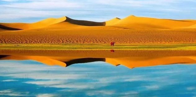 巴丹吉林沙漠年降水量不足40毫米,但是沙漠中的湖泊竟然多達100多個。高聳入云的沙山,神秘莫測的鳴沙,靜謐的湖泊、濕地,構(gòu)成了巴丹吉林沙漠獨特的迷人景觀,于2005年被《中國國家地理》雜志評為中國最美麗的沙漠,每年吸引了上萬名國內(nèi)外游客前來觀光。