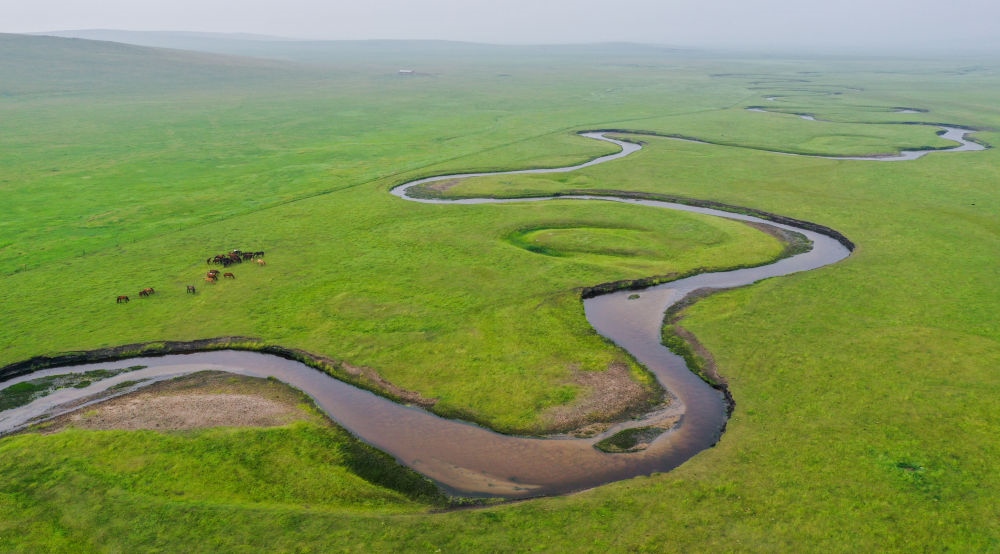 這是內(nèi)蒙古錫林郭勒盟東烏珠穆沁旗乃林高勒的草原風光(2021年7月12日攝,無人機照片)。新華社記者連振攝