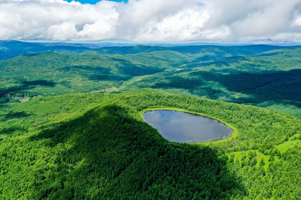 這是內(nèi)蒙古阿爾山天池風光(2021年7月14日攝,無人機照片)。新華社記者連振攝