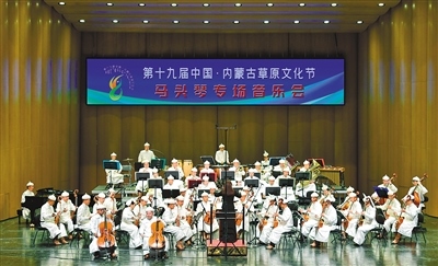 在第十九屆中國·內(nèi)蒙古草原文化節(jié)馬頭琴專場(chǎng)音樂會(huì)上,中國烏審馬頭琴交響樂團(tuán)演奏《草原歡歌》。音樂會(huì)分為上半場(chǎng)和下半場(chǎng),分別由烏審馬頭琴交響樂團(tuán)和齊·寶力高野馬馬頭琴樂團(tuán)演奏,為觀眾開啟氣勢(shì)磅礴富有草原文化特色的音樂之旅。記者 王磊 攝