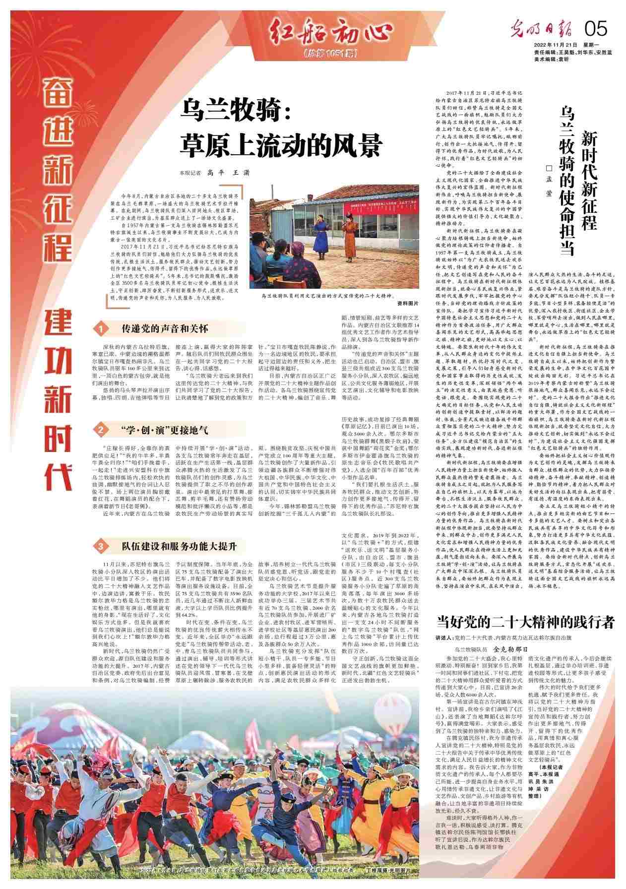 2017年11月21日,習(xí)近平總書(shū)記給蘇尼特右旗烏蘭牧騎的隊(duì)員們回信,勉勵(lì)他們大力弘揚(yáng)烏蘭牧騎的優(yōu)良傳統(tǒng),扎根生活沃土,服務(wù)牧民群眾,推動(dòng)文藝創(chuàng)新,努力創(chuàng)作更多接地氣、傳得開(kāi)、留得下的優(yōu)秀作品,永遠(yuǎn)做草原上的“紅色文藝輕騎兵”。5年來(lái),總書(shū)記的殷殷囑托,激勵(lì)全區(qū)3500多名烏蘭牧騎隊(duì)員牢記初心使命、根植生活沃土,守正創(chuàng)新、踔厲奮發(fā),不斷創(chuàng)新服務(wù)形式,送歡樂(lè)、送文明,傳遞黨的聲音和關(guān)懷,為人民服務(wù)、為人民放歌。