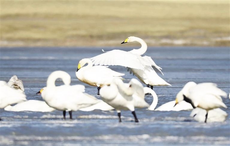 晶晶和盈盈姐妹倆休憩在湖面上,多日的北歸之旅已讓它們疲憊不堪。晶晶說:“紅堿淖總給我一種家的感覺。”