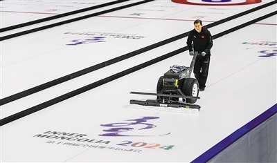 12月7日,走進(jìn)位于呼倫貝爾市海拉爾區(qū)的內(nèi)蒙古自治區(qū)冰上運(yùn)動(dòng)訓(xùn)練中心冰球冰壺館,只見(jiàn)制冰師正在一遍又一遍地修整冰面,為即將到來(lái)的“十四冬”冰壺項(xiàng)目青年組比賽做準(zhǔn)備。