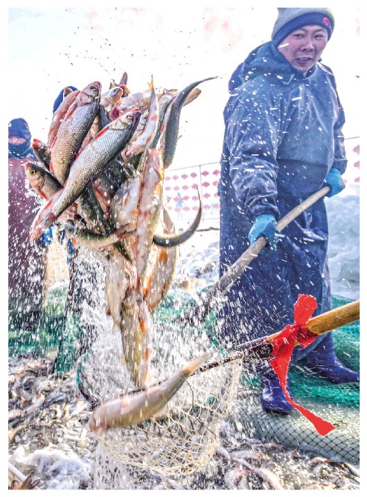▲1月13日,達(dá)里湖漁場(chǎng)的工作人員在撈魚(yú)裝箱。日前,內(nèi)蒙古達(dá)里湖冬捕旅游季在赤峰市克什克騰旗拉開(kāi)帷幕。此次活動(dòng)包括祭湖儀式、開(kāi)湖捕魚(yú)、文藝展演等多個(gè)項(xiàng)目,吸引眾多游人前來(lái)觀(guān)看。新華社記者彭源攝
