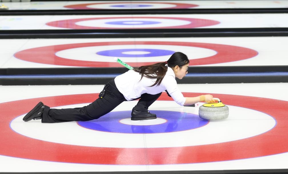 ??1月12日,文馨悅在比賽中擲壺。在第十四屆全國冬季運(yùn)動(dòng)會(huì)冰壺青年組混雙金牌賽中,黑龍江隊(duì)選手李思霖/文馨悅奪得金牌。新華社記者 王楷焱 攝