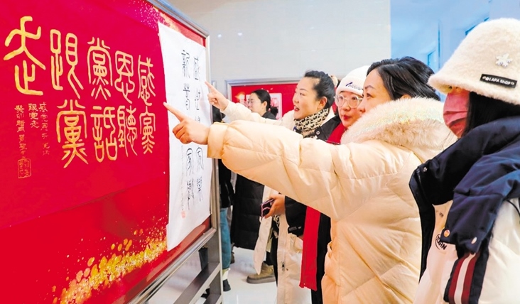 各類參展作品掛在以紅色為底的展板上,新年的氛圍感瞬間拉滿?!芭e辦這次活動(dòng)特別有意義,真的很喜歡這種文化氛圍?!眱?nèi)蒙古自治區(qū)第八屆道德模范獲得者鄭洪山邊看邊說。