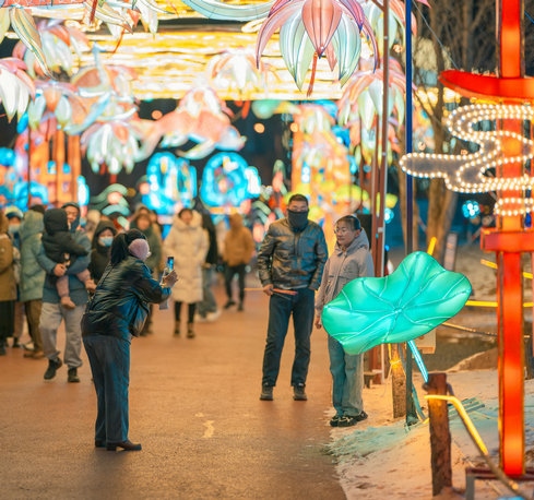 當(dāng)晚,呼和浩特零下15攝氏度左右,寒冷擋不住市民欣賞流光溢彩的燈會,只見市民穿著保暖的外套,戴著帽子手套,一邊逛燈會,一邊拍照片、拍視頻,還有的市民開直播,與全國各地的網(wǎng)友一起分享這美好時(shí)刻。
