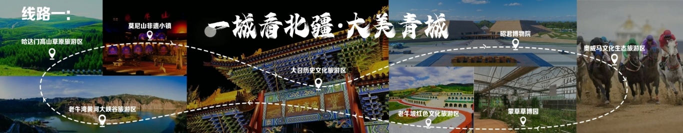 行程由呼和浩特出發(fā),至哈達門高山草原旅游區(qū),至莫尼山非遺小鎮(zhèn),至大召歷史文化旅游區(qū),再至昭君博物院,再至奧威馬文化生態(tài)旅游區(qū),再至蒙草草博園,再至老牛坡紅色文化旅游區(qū),終點為老牛灣黃河大峽谷旅游區(qū)。