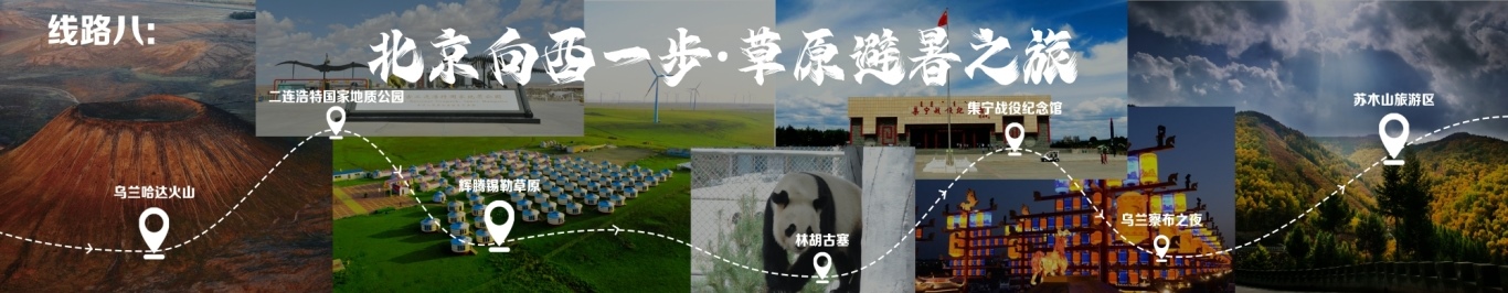 線路行程由北京出發(fā),至烏蘭哈達火山,至二連浩特國家地質公園,至輝騰錫勒草原,至林胡古塞,再至集寧戰(zhàn)役紀念館,再至烏蘭察布之夜,終點為蘇木山旅游區(qū)。