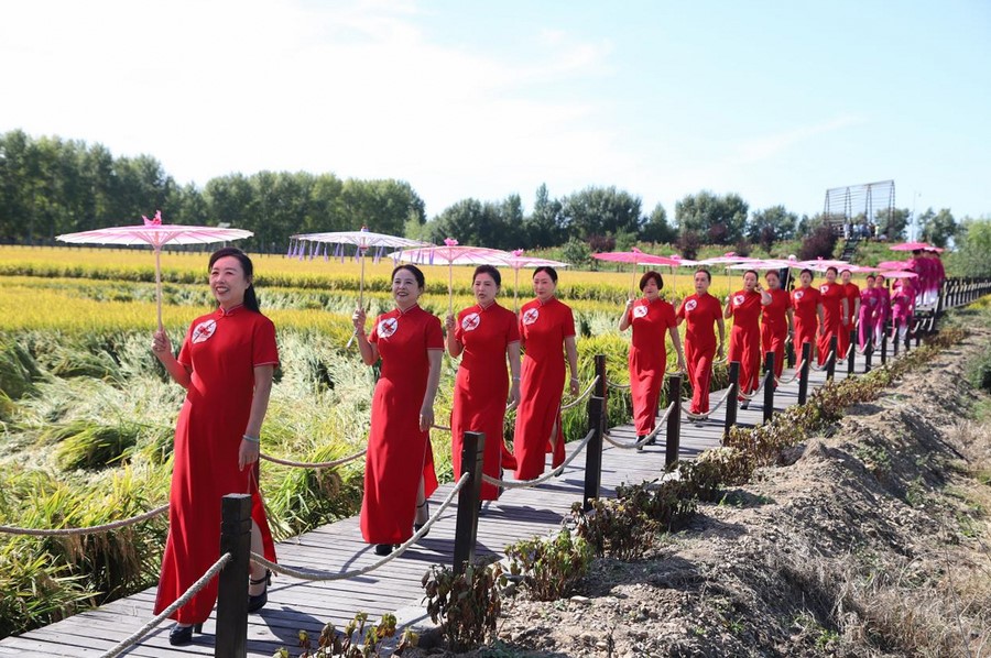 撐傘、轉(zhuǎn)身、回眸……旗袍愛好者們舉手投足盡顯高貴典雅的氣質(zhì),完美地秀出女性典雅溫婉、健康積極和充滿活力的新時代精神面貌, 成為扎賚特旗好力保稻谷景區(qū)一幅古韻靈動的畫卷。