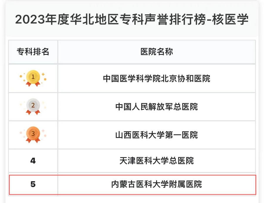 內(nèi)蒙古醫(yī)科大學(xué)附屬醫(yī)院核醫(yī)學(xué)科位列華北區(qū)第五,神經(jīng)外科、婦產(chǎn)科、風(fēng)濕科、重癥醫(yī)學(xué)、眼科、消化科、生殖醫(yī)學(xué)、腎臟病、皮膚科、內(nèi)分泌科、麻醉科、老年醫(yī)學(xué)、口腔科、檢驗(yàn)醫(yī)學(xué)、急診醫(yī)學(xué)、變態(tài)反應(yīng)、疼痛學(xué)、罕見(jiàn)病、耳鼻喉科、健康管理、血液科、整形外科等22個(gè)??偏@提名,是內(nèi)蒙古自治區(qū)在此榜單獲前五和提名??谱疃嗟尼t(yī)院。