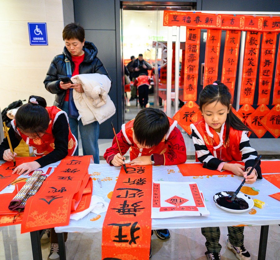 小朋友也參與到寫春聯(lián)的活動(dòng)中