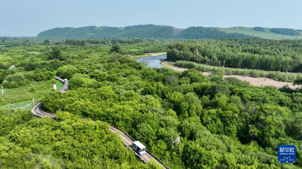 2024年7月2日,游客乘車在呼倫貝爾市額爾古納國家濕地公園游玩(無人機照片)。新華社記者 貝赫 攝