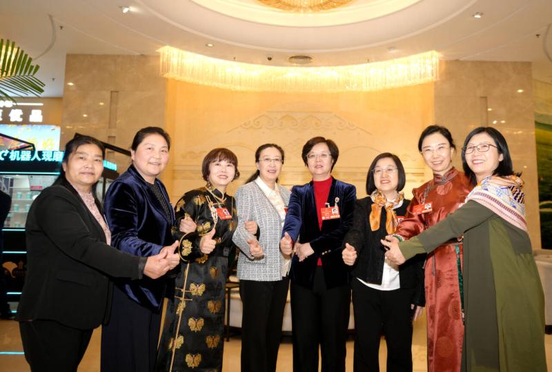 3月7日,參加十四屆全國(guó)人大三次會(huì)議的內(nèi)蒙古代表團(tuán)的部分女代表們?cè)隈v地合影,迎接即將到來(lái)的三八婦女節(jié),表達(dá)了對(duì)全國(guó)女性的美好祝愿。記者 馬建兵 攝