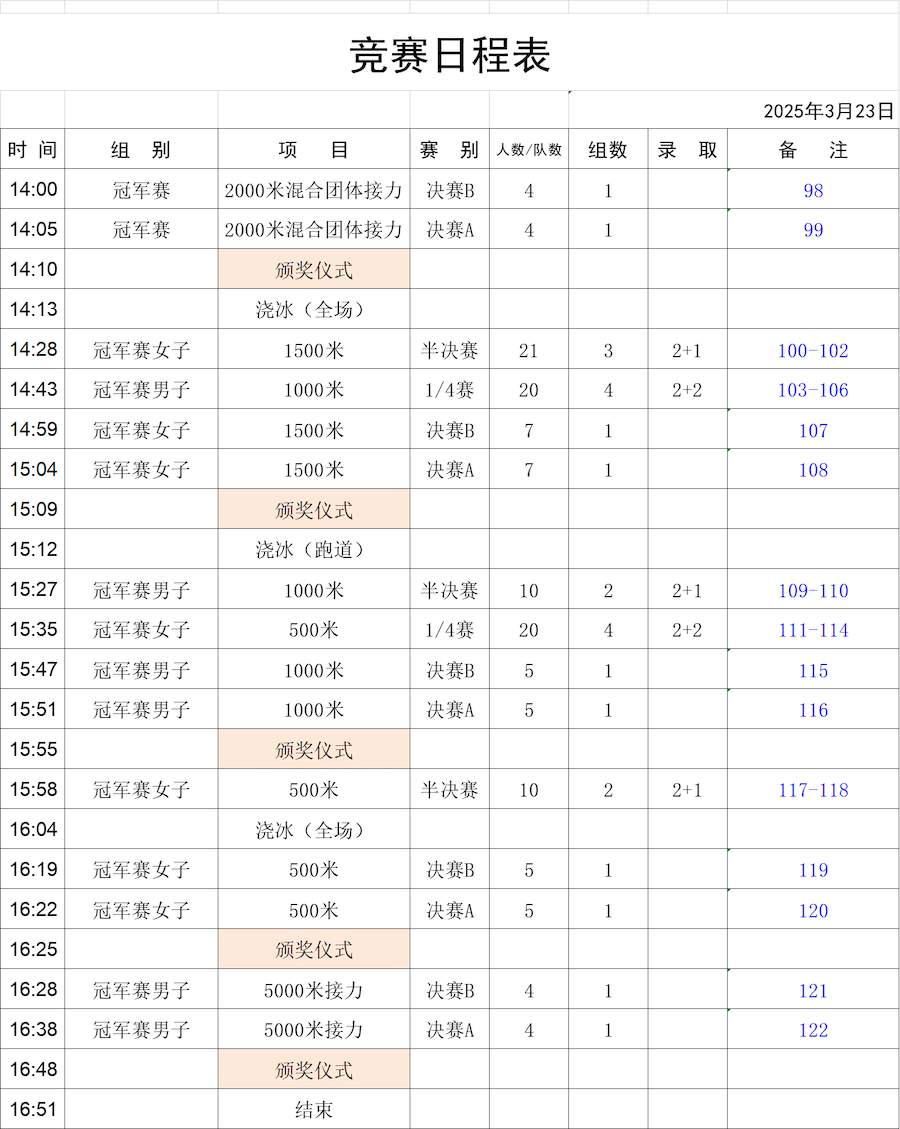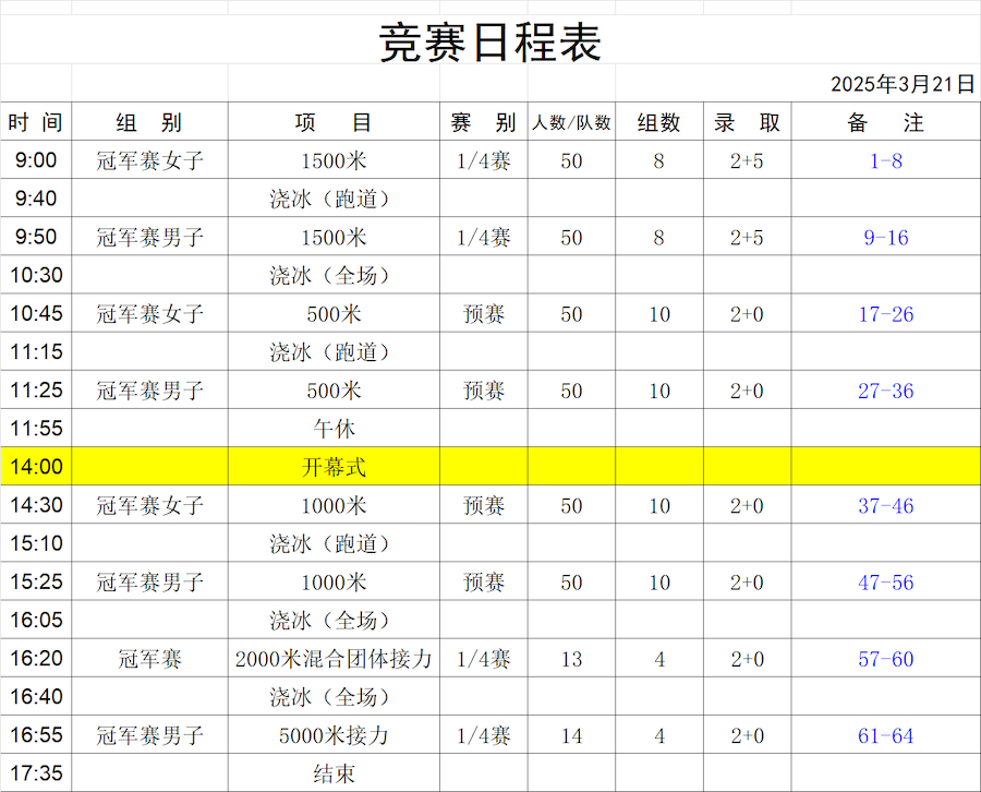 比賽項(xiàng)目包括男女500米、1000米、1500米以及接力賽等多個(gè)項(xiàng)目。
