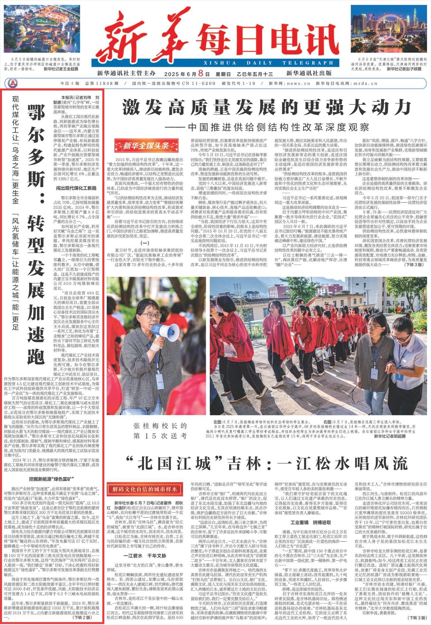 2025年6月8日,《新華每日電訊》第1版刊發(fā)題為《鄂爾多斯:轉(zhuǎn)型發(fā)展加速跑》一文,報道了近年來,內(nèi)蒙古資源型城市鄂爾多斯正通過延伸煤炭產(chǎn)業(yè)鏈、布局新能源產(chǎn)業(yè),構(gòu)建起特色鮮明的現(xiàn)代能源產(chǎn)業(yè)體系,以科技創(chuàng)新、產(chǎn)業(yè)升級跑出資源型城市轉(zhuǎn)型“加速度”。