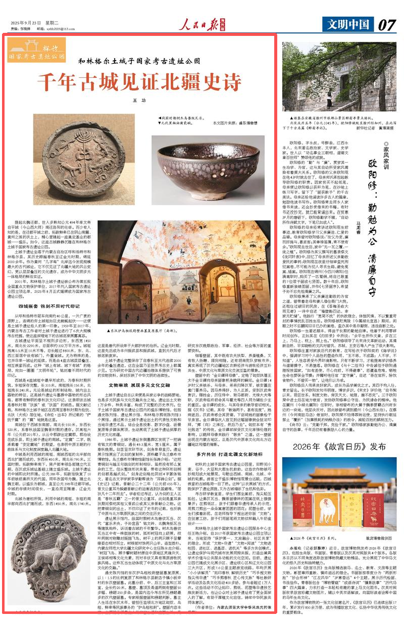2025年9月23日,《人民日報海外版》第7版刊發(fā)題為《和林格爾土城子國家考古遺址公園千年古城見證北疆史詩(探訪國家考古遺址公園)》的文章,報道了土城子遺址坐落于內(nèi)蒙古自治區(qū)呼和浩特市和林格爾縣,其歷史跨越春秋至遼金元時期,綿延2000余年。