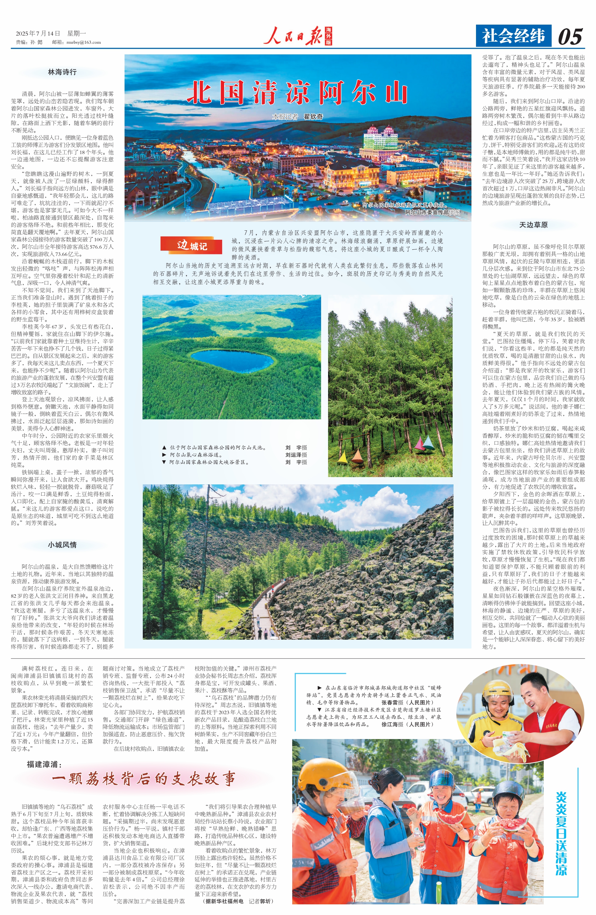 2025年7月14日《人民日報海外版》第5版刊發(fā)了題為《北國清涼阿爾山》的文章,報道了7月,內(nèi)蒙古自治區(qū)興安盟阿爾山市,這座隱匿于大興安嶺西南麓的小城,沉浸在一片沁人心脾的清涼之中。林海綠浪翻涌,草原舒展如畫,邊境的微風(fēng)裹挾著青草與松脂的馥郁氣息,將這座小城的夏日釀成了一杯令人陶醉的美酒。