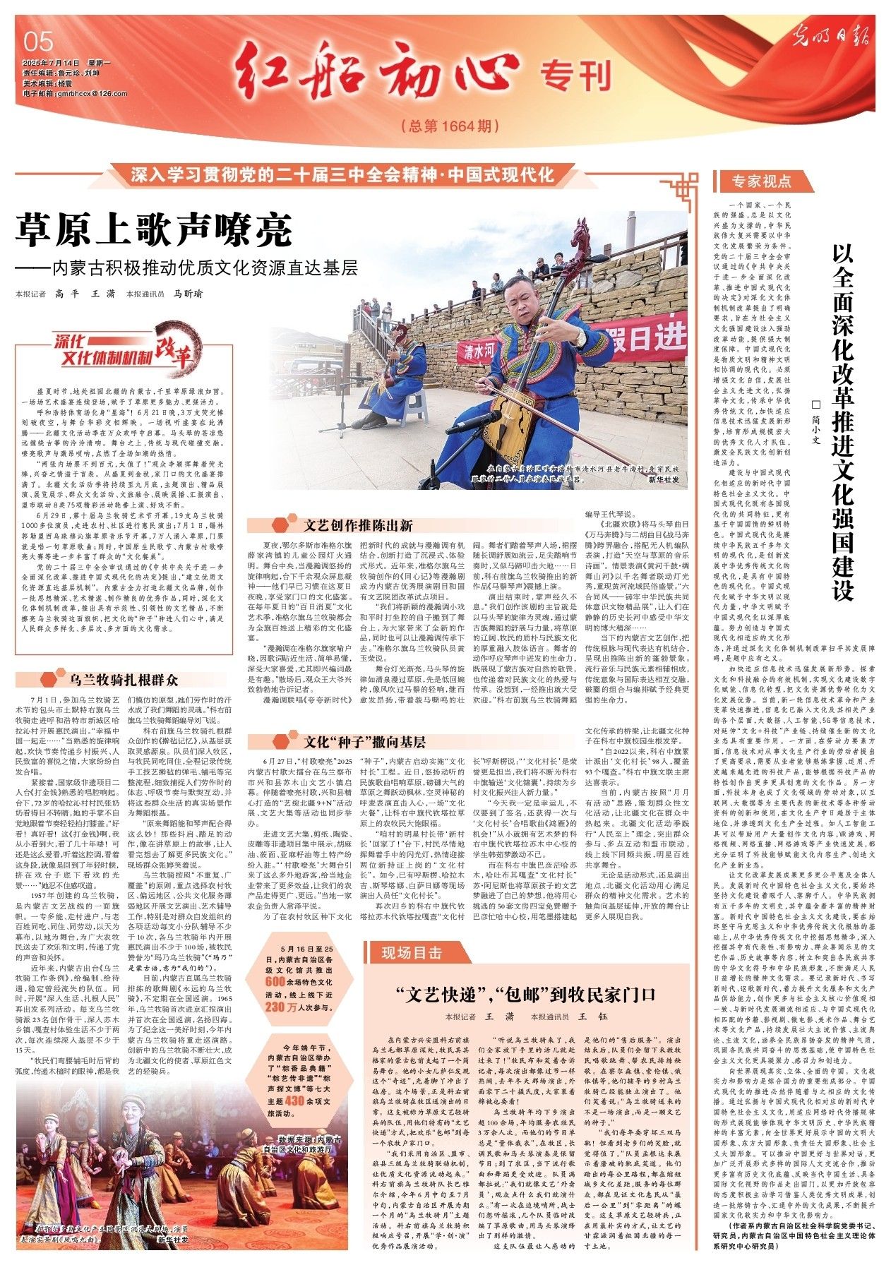 2025年7月14日,《光明日報(bào)》第5版刊發(fā)題為《草原上歌聲嘹亮——內(nèi)蒙古積極推動優(yōu)質(zhì)文化資源直達(dá)基層》的文章,報(bào)道了盛夏時(shí)節(jié),地處祖國北疆的內(nèi)蒙古,千里草原綠浪如茵。一場場藝術(shù)盛宴連續(xù)登場,賦予了草原更多魅力、更強(qiáng)活力。