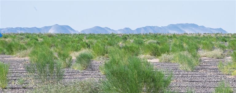 “這里是內(nèi)蒙古阿拉善盟西部荒漠綜合治理項目(二期)額濟納河片區(qū),是內(nèi)蒙古深入貫徹落實國家生態(tài)戰(zhàn)略、打贏河西走廊—塔克拉瑪干沙漠邊緣阻擊戰(zhàn)關(guān)鍵戰(zhàn)場之一。我們在這里人工種草6萬畝,現(xiàn)在已經(jīng)全部完成栽種,正在進行養(yǎng)護工作?!鳖~濟納河片區(qū)負責人關(guān)新偉介紹,項目由阿拉善盟林業(yè)和草原局推進,中國建筑一局有限公司、中鐵四局集團有限公司等承建,額濟納旗林業(yè)和草原局為項目建設提供技術(shù)支撐。