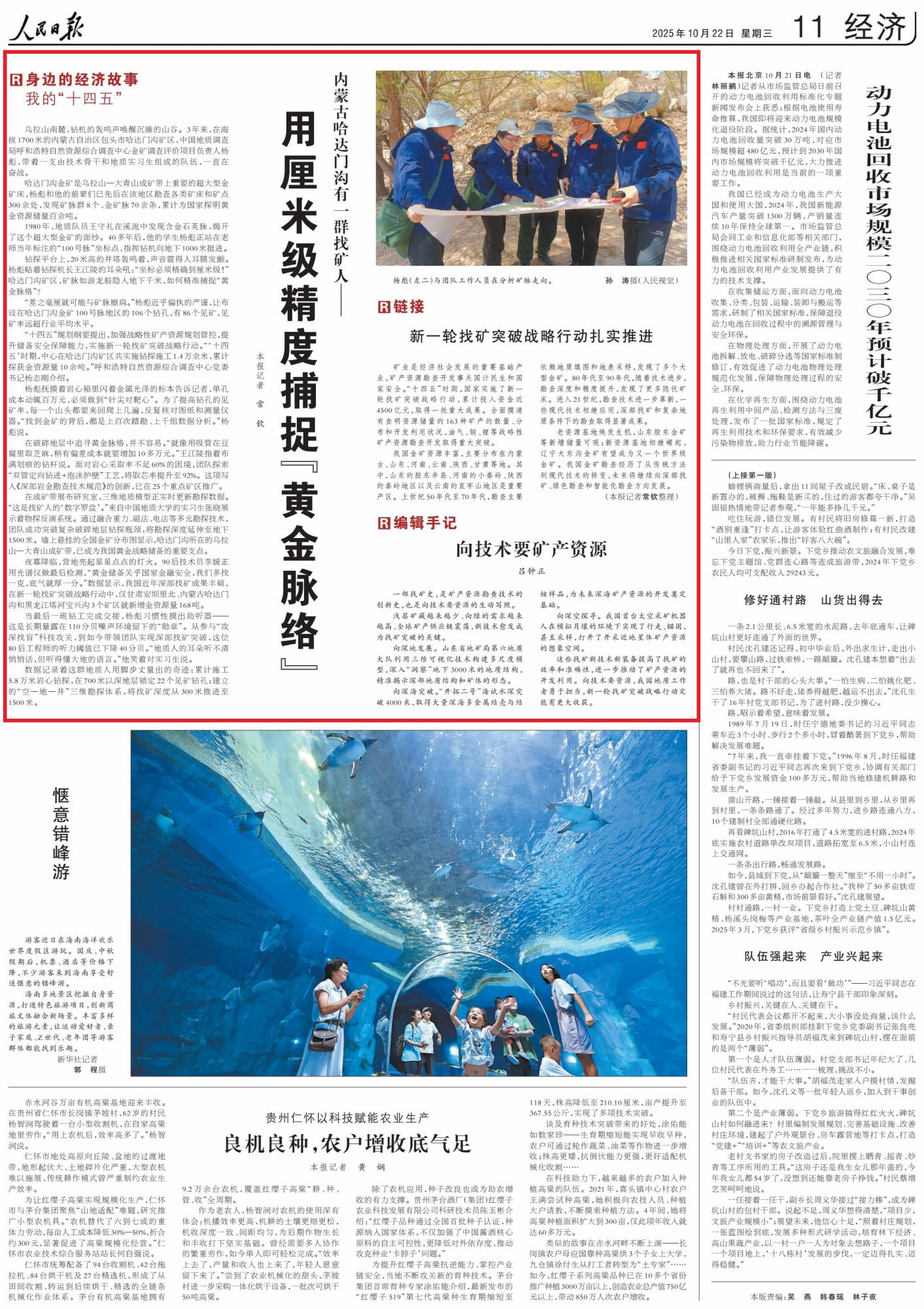 2025年10月22日,《人民日?qǐng)?bào)》第11版刊發(fā)題為《內(nèi)蒙古哈達(dá)門(mén)溝有一群找礦人——用厘米級(jí)精度捕捉“黃金脈絡(luò)”》的文章,報(bào)道了中國(guó)地質(zhì)調(diào)查局楊彪團(tuán)隊(duì)在內(nèi)蒙古哈達(dá)門(mén)溝礦區(qū)奮戰(zhàn)3年,依托前輩基礎(chǔ),累計(jì)探明黃金百余噸,“十四五”期間新增10余噸,鉆孔見(jiàn)礦率超行業(yè)平均。